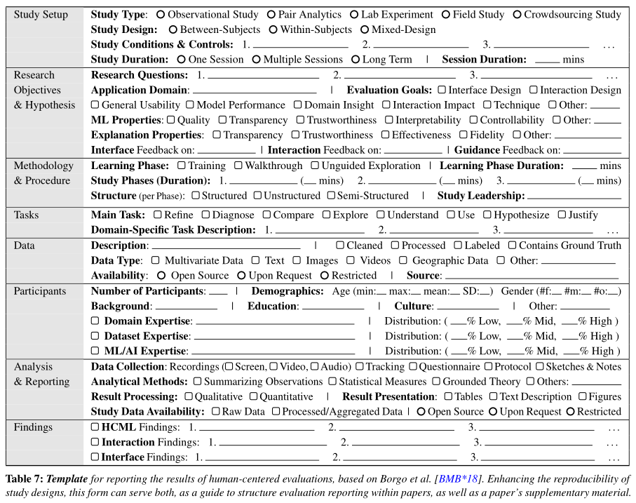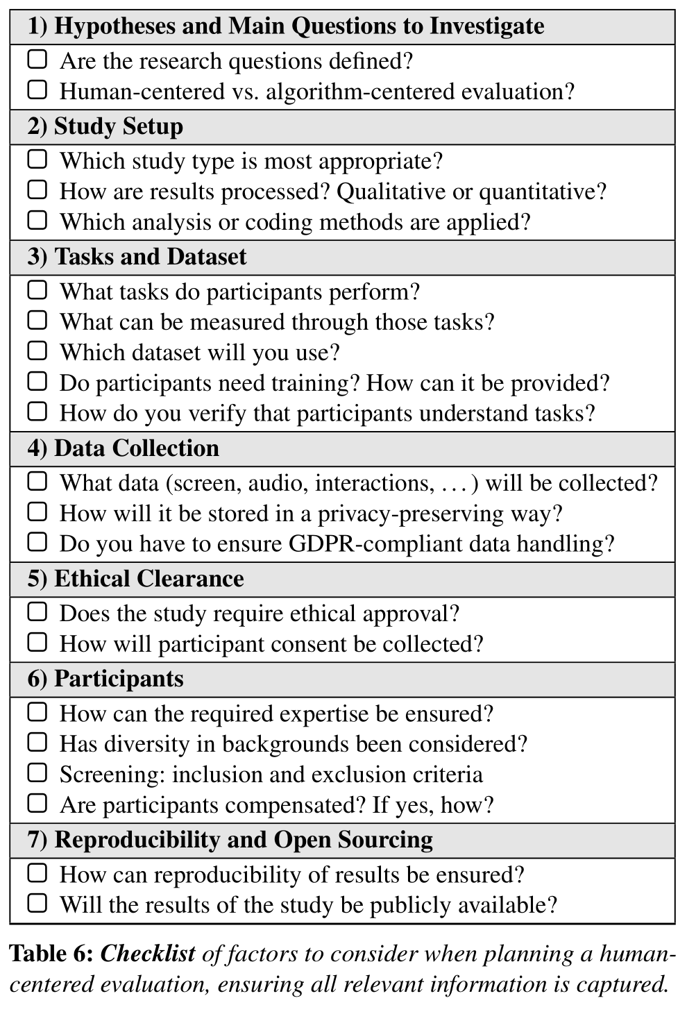 This checklist aims to facilitate the creation of study designs and ensure that relevant factors are covered before participants are evaluated. While most points should be self-explanatory, here is a brief summary:- Ordered checklist to work through during the ideation and setup of human-centered evaluations