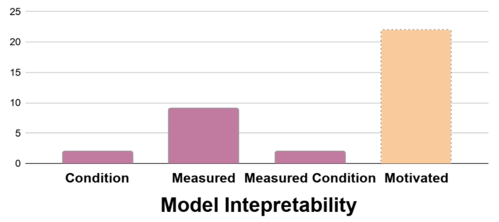 Interpretability is the model property most frequently measured. Still, more papers motivate this property without evaluation.