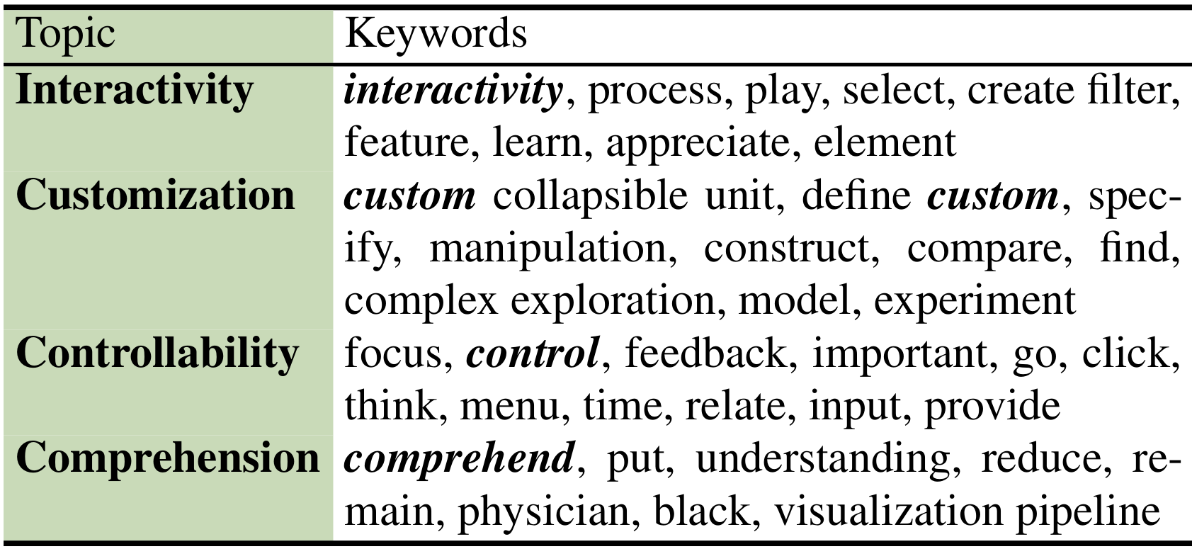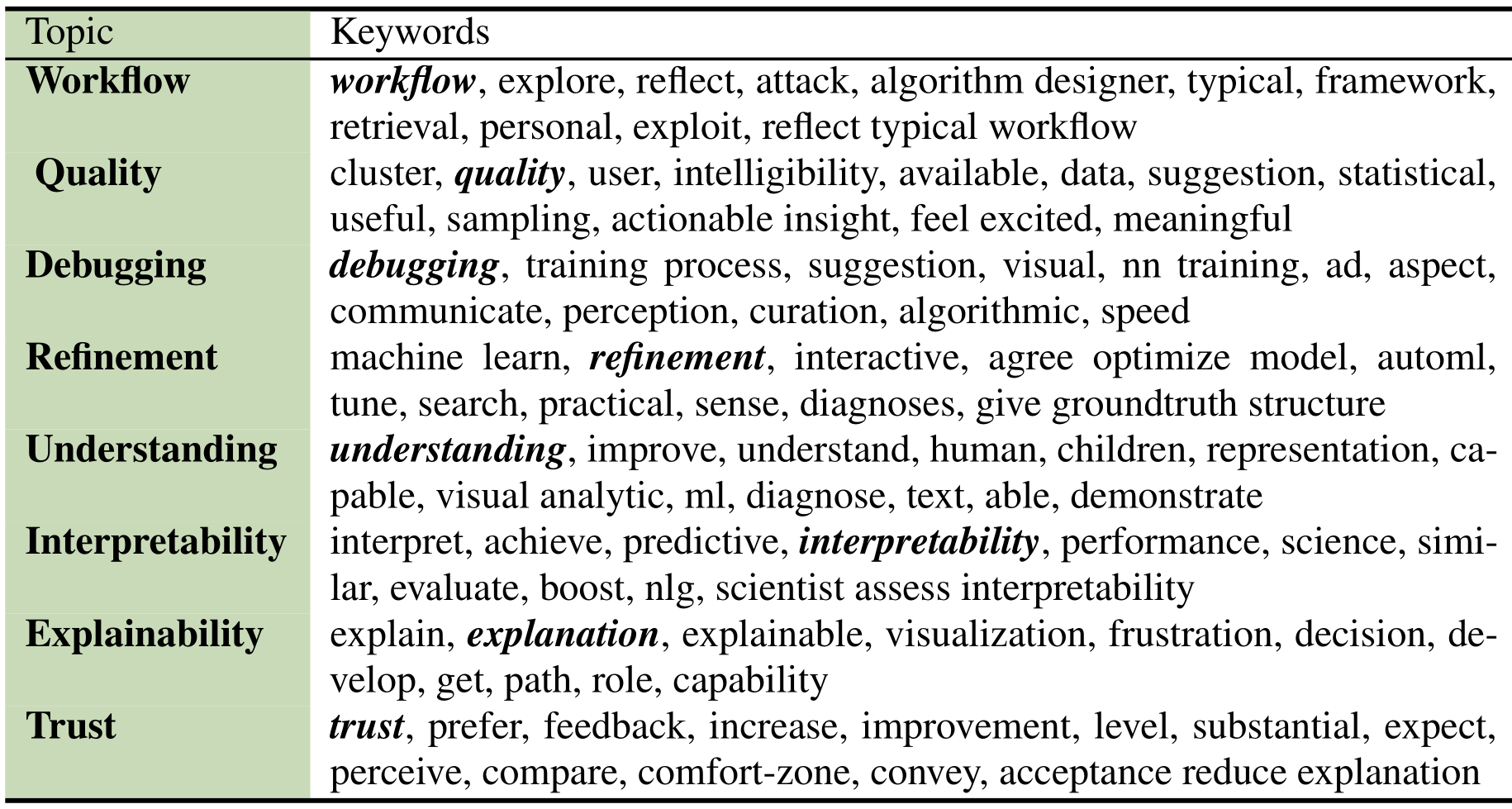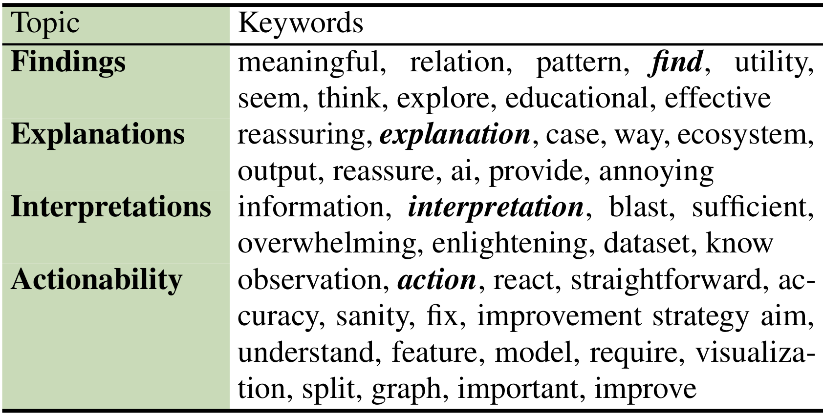 The interface feedback topics highlight the usefulness of explanations and interactions for interpretability.
