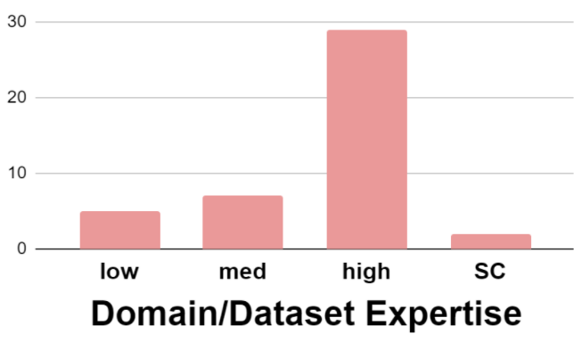 Typically, participants are experts in the system domain or the dataset used during the study. Few papers evaluate the influence of expertise on study outcomes (SC).