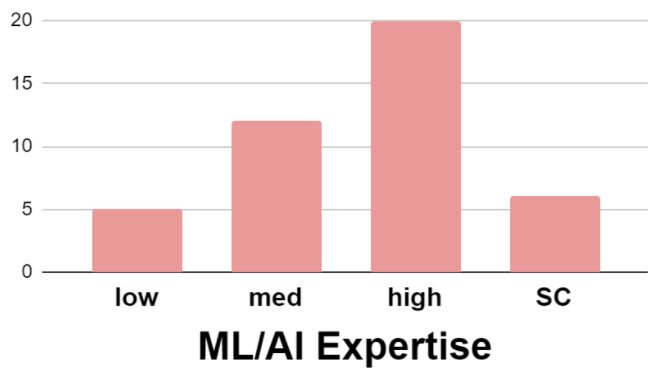 While most participants are experts in machine learning, several papers rely on participants with intermediate knowledge. Few papers evaluate the influence of expertise on study outcomes (SC).
