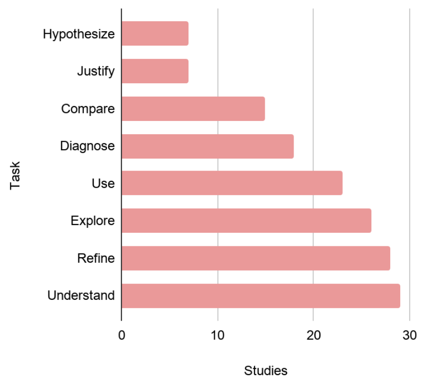 Most studies evaluate understanding and refinement. Few studies consider hypothesize creation or model justification. Several studies let participants use models without model-specific tasks.