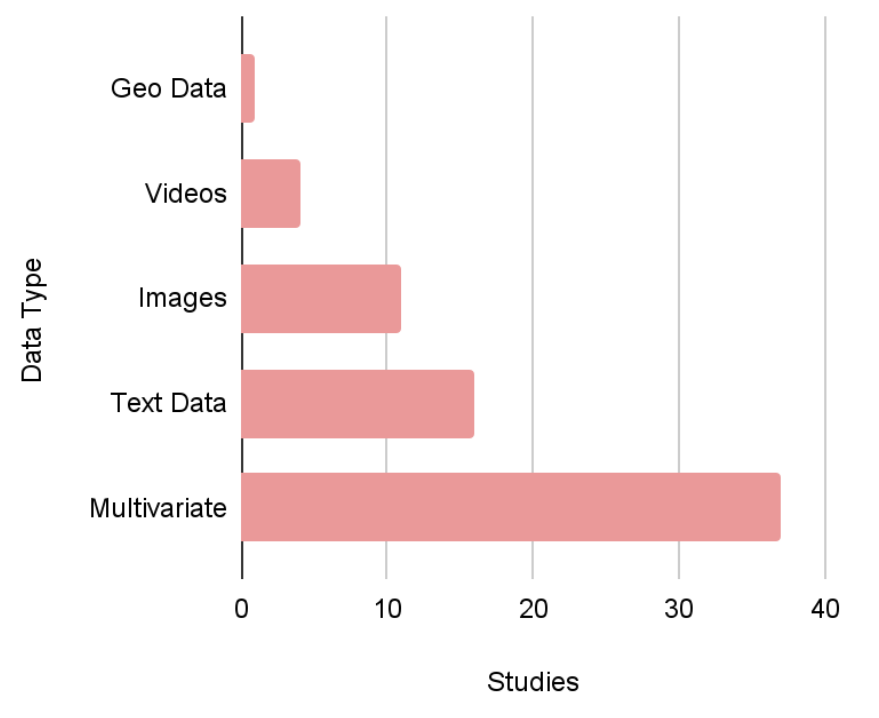 The most frequently used datatype was multivariate data, followed by text data and images. Only few systems deal with videos or geographical data.